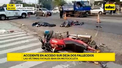 Este artículo tiene 1 año de antigüedad Cerca de las 5:30 se registró un accidente fatal sobre la ruta PY01 (ex Acceso Sur), a la altura de Cañadita, Ñemby. Una pareja que iba a bordo de una motocicleta perdió la vida, el otro vehículo involucrado es un tractocamión y se desconoce con certeza las circunstancias del percance.