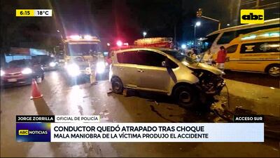 Este artículo tiene 1 año de antigüedad El conductor de un automóvil Toyota Ractis quedó atrapado y sufrió heridas luego de un choque contra una camioneta Toyota Hilux sobre la Ruta PY 01 c/ Primer Intendente de Ñemby. La víctima fue rescatado por Bomberos Voluntarios y luego trasladado al Hospital de Trauma. El otro conductor de la camioneta, salió ileso y dio negativo al alcotest.
