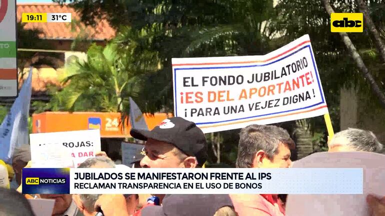 Este artículo tiene 1 año de antigüedad Una manifestación de distintos gremios de jubilados se realizó frente a la Caja Central del IPS, reclamando una mayor transparencia en el uso de bonos, el pago del aguinaldo este 2024 y el reajuste de los haberes jubilatorios.