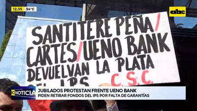 Este artículo tiene 1 año de antigüedad Integrantes de la Corriente Sindical Clasista se manifestaron frente a ueno bank en protesta por la colocación de los fondos del IPS en esta entidad bancaria, que tendría vínculos con el exmandatario Horacio Cartes y el presidente de la República, Santiago Peña, accionista de ueno Holding.