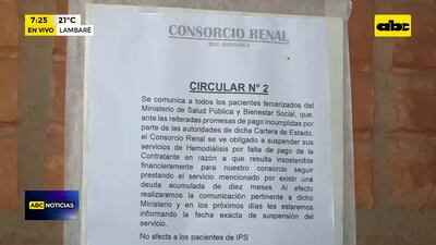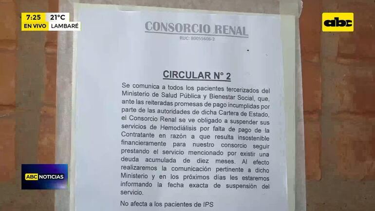 Este artículo tiene 1 año de antigüedad Pacientes renales que acuden al Hospital del Corazón en Lambaré y dependen de la diálisis para seguir viviendo, se muestran preocupados ante el anuncio de que el servicio será interrumpido a causa de una deuda del Ministerio de Salud con una firma tercerizada. Los pacientes lamentan el derroche de dinero público y la desatención de las autoridades a los ciudadanos que dependen del sistema público de salud.