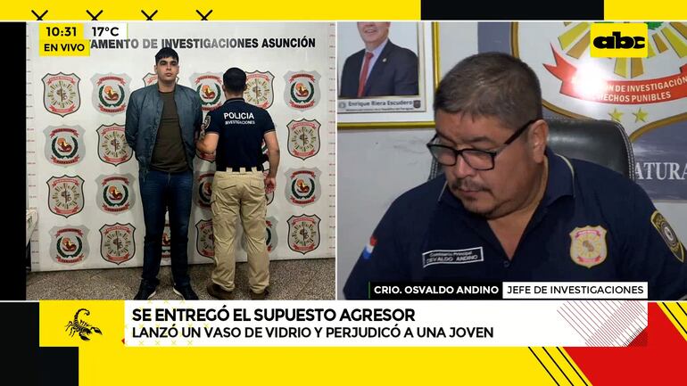 Este artículo tiene 1 año de antigüedad Elián Fernando Tomás Torres, sindicado de ser el supuesto autor de la agresión que le costó un ojo a una joven dentro de una discoteca el fin de semana, finalmente se presentó ante las autoridades. El comisario Osvaldo Andino, jefe de Investigaciones de Asunción, relató que el lunes fueron hasta la vivienda del sospechoso y no lo encontraron, pero sus padres dijeron que se entregaría en la Fiscalía, lo cual se concretó este martes.