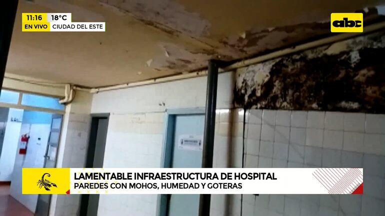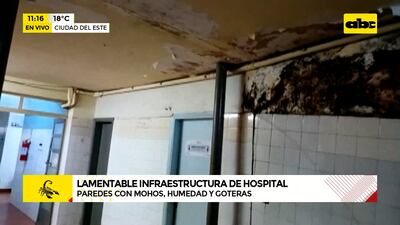 Este artículo tiene 1 año de antigüedad El moho se adueña de las paredes de un sector del Hospital Regional de Ciudad del Este, el centro médico de referencia para el departamento de Alto Paraná, donde los médicos están atados de pies y manos a la espera de la reacción del Ministerio de Salud. El director, Federico Schrodel, mencionó que están en marcha obras de refacción con apoyo de la Gobernación para subsanar los problemas de filtración en el techo.