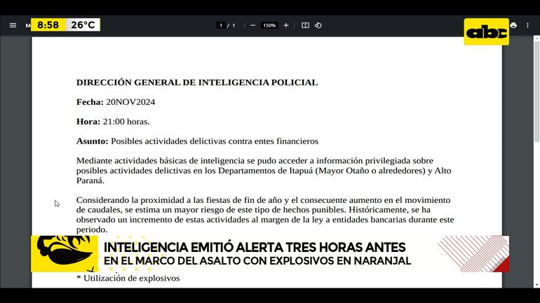 Este artículo tiene 1 año de antigüedad La Policía Nacional, a través de su Dirección de Inteligencia, emitió un memorándum de carácter clasificado en el que advertía de posibles hechos delictivos contra entes financieros. Tres horas después se concretaba el asalto con explosivos en perjuicio de un banco en la localidad de Naranjal.