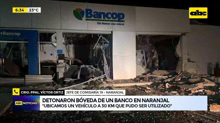Este artículo tiene 1 año de antigüedad Al menos 10 delincuentes fuertemente armados detonaron explosivos en un banco ubicado en la localidad de Naranjal, Alto Paraná. El hecho se registró pasada la medianoche y el comisario principal Víctor Ortiz, jefe de la Comisaría 19ª de Naranjal, relató que la banda actuó justo cuando ellos estaban haciendo patrullajes en la ruta principal, esperando a un camión de encomienda al cual iban a custodiar para evitar que sea atacado por “piratas del asfalto”.