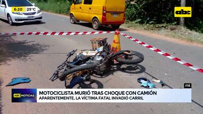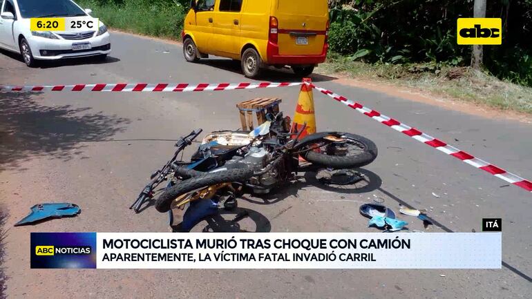 Este artículo tiene 1 año de antigüedad Un motociclista murió al chocar frontalmente contra un camión en la compañía Pehuajó de la ciudad de Itá. Según el informe de la Policía, el ahora fallecido realizó un adelantamiento indebido en una curva, invadiendo el carril del vehículo de gran porte, produciendo el accidente.
