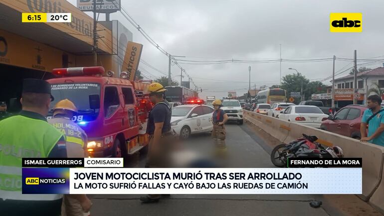 Este artículo tiene 1 año de antigüedad Un motociclista falleció tras ser arrollado por un camión sobre la ruta PY02, en la intersección de la calle Arroyos y Esteros, barrio Ita Ka’aguy, en Fernando de la Mora. Según el conductor del tracto camión, la joven víctima perdió el control de su biciclo tras caerse la cadena de su moto y allí fue a parar bajo las ruedas del camión.