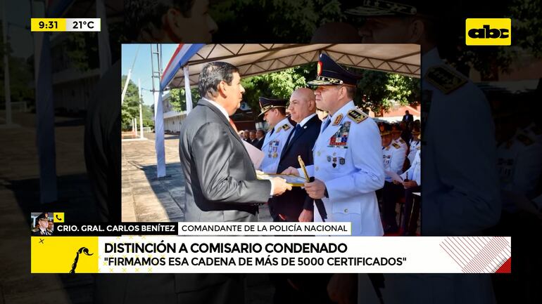 Este artículo tiene 1 año de antigüedad Hermes García Balmaceda, un comisario retirado con múltiples condenas por corrupción, recibió un certificado de manos del propio comandante de la Policía Nacional, Carlos Benítez, quien minimizó la situación argumentando que la distinción fue entregada en el marco de los 50 años de una promoción y no fue una condecoración a la persona en cuestión. No obstante, reconoció que se trató de una situación fuera de lugar y dijo que harán una revisión para mejorar los filtros en este tipo de eventos protocolares.