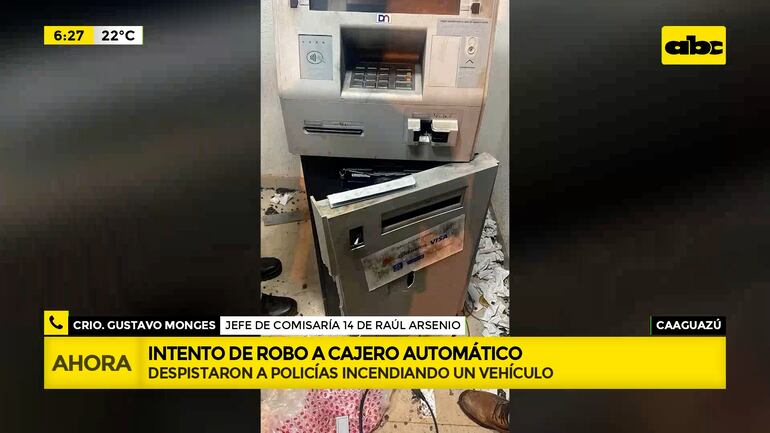 Este artículo tiene 1 año de antigüedad La Policía Nacional informó un intento de robo de cajero automático del Banco Nacional de Fomento (BNF) instalado en el predio de la Comisaría 14ª de Raúl Arsenio Oviedo, departamento de Caaguazú. Los supuestos autores incendiaron previamente un automóvil a más de 10 kilómetros del predio policial para despistar al personal de turno, según reveló la Policía.
