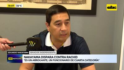 Este artículo tiene 1 año de antigüedad Como un “arrogante” y un funcionario “de cuarta categoría” calificó este lunes el senador Eduardo Nakayama al titular de la Senad, Jalil Rachid. El legislador manifestó que el Presidente de la República tuvo que haberlo destituido de su cargo “hace rato” por involucrar a Paraguay en un papelón internacional.