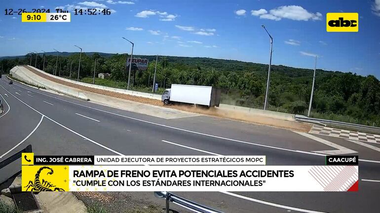Este artículo tiene 1 año de antigüedad Solo este año la rampa de frenado, ubicada en el kilómetro 48 de la ruta PY02, fue usada casi 30 veces, evitando accidentes que pudieron costar la vida de al menos 100 personas de forma directa, según datos que maneja el Ministerio de Obras Públicas. El Ing. José Cabrera, Coordinador de la Unidad Ejecutora de Proyectos Estratégicos del MOPC, brindó detalles acerca de las características de la estructura, que hasta ahora es la única construida a nivel nacional.
