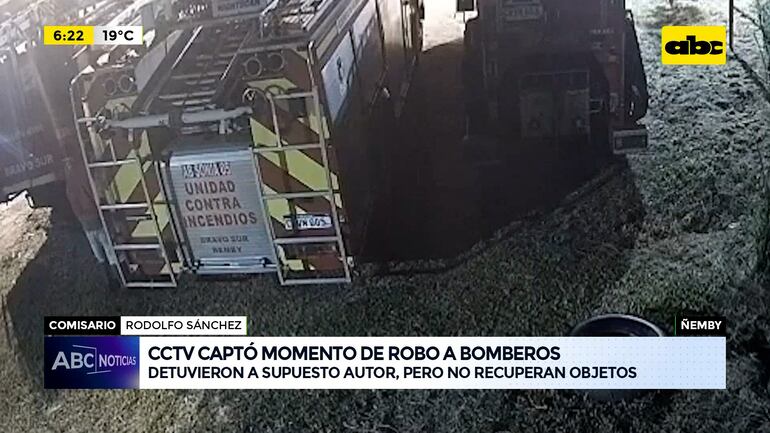 Este artículo tiene 1 año de antigüedad Mediante imágenes de circuito cerrado, la policía pudo identificar y detener a un hombre, quien es el sospechoso de haber ingresado al cuartel de bomberos voluntarios de Ñemby y de llevar varias herramientas y un acople reductor. Según la denuncia, no es la primera vez que el sindicado entró al local. Tras su arresto, el hombre admitió la autoría y aparentemente los objetos robados ya fueron vendidos en la zona y la policía está tratando de recuperar.
