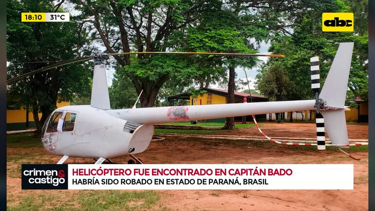 Este artículo tiene 2 años de antigüedad El helicóptero Robinson R44 que había sido robado en el estado de Paraná, Brasil, y posteriormente hallado en un área boscosa de la colonia Potrerito (a 15 kilómetros de Capitán Bado) será llevado a la base de la Policía en Capitán Bado, donde se procederá a su entrega a las autoridades brasileñas, previo peritaje.