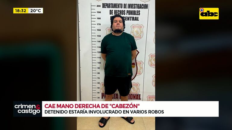Este artículo tiene 1 año de antigüedad El personal de Investigaciones del departamento Central logró la detención del presunto autor del robo agravado a un cambista que ocurrió en noviembre del 2023, durante el cual el comerciante resultó herido. Según la Policía Nacional, el sospechoso sería la “mano derecha” del temido asaltante Diego Daniel Ruiz Díaz Molinas, alias “Diego Cabezón”.