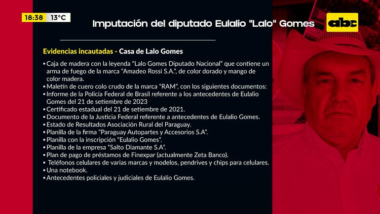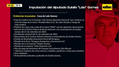 Este artículo tiene 1 año de antigüedad De la vivienda del diputado Eulalio “Lalo” Gomes la comitiva fiscal incautó un maletín de cuero colo crudo de la marca “RAM”, con los siguientes documentos que estaban en su interior: informe de la Policía Federal de Brasil referente a los antecedentes de Eulalio Gomes del 21 de setiembre de 2023; un certificado estadual de la misma fecha y un documento de la Justicia Federal referente a antecedentes de Eulalio Gomes.
