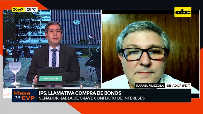Este artículo tiene 1 año de antigüedad El senador Rafel Filizzola, se refirió a la adquisición del Instituto de Previsión Social (IPS), de bonos financieros de Ueno Bank, del cual es accionista el presidente Santiago Peña, por un monto de G. 250.000 millones. “Acá hay unas cosas raras, por ejemplo la celeridad, unos días después de que se presentó la oferta se hizo la operación, una celeridad llamativa. Participó de la operación una asesora externa, ¿por qué la necesidad de una asesoría externa cuando hay un servicio jurídico en la entidad? “, dijo el senador.