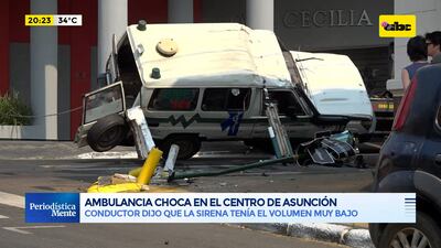 Este artículo tiene 2 años de antigüedad Un choque entre un vehículo particular y una ambulancia ocurrió en la tarde de este domingo, cuando la ambulancia cruzó la luz roja a gran velocidad sobre la calle Estados Unidos, del microcentro de Asunción. En la intersección de la calle 25 de mayo, venía un vehículo particular a 50 km/ hora. Al darle la luz verde, cruzó e impactó contra la ambulancia, que circulaba sobre la calle Estados Unidos, haciéndola volcar.