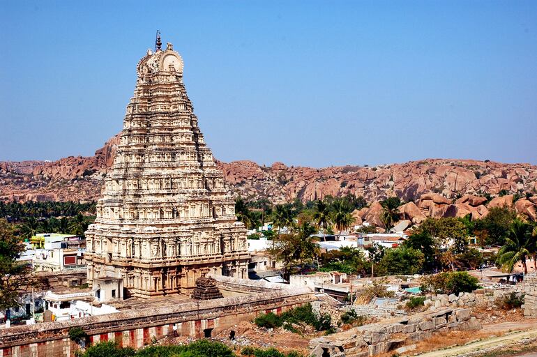 Entre esas moles de piedra surgen palmeras y pequeños poblados, mientras el río Tungabhadra serpentea entre orillas de arena y escalinatas de piedra.