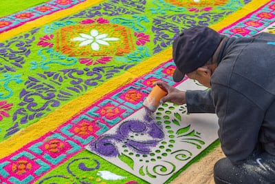 Las alfombras se elaboran con aserrín teñido, flores, hojas de pino, frutas y moldes que dibujan figuras geométricas, escenas religiosas y motivos naturales.